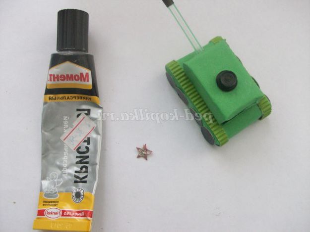 Приклеюємо зірочки( можна з картону червоного кольору) з двох сторін.