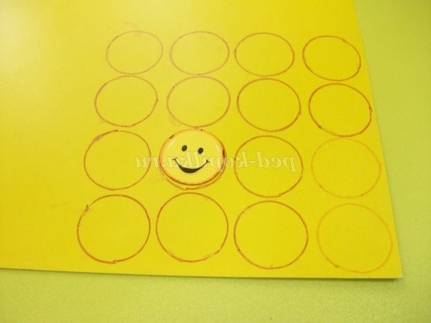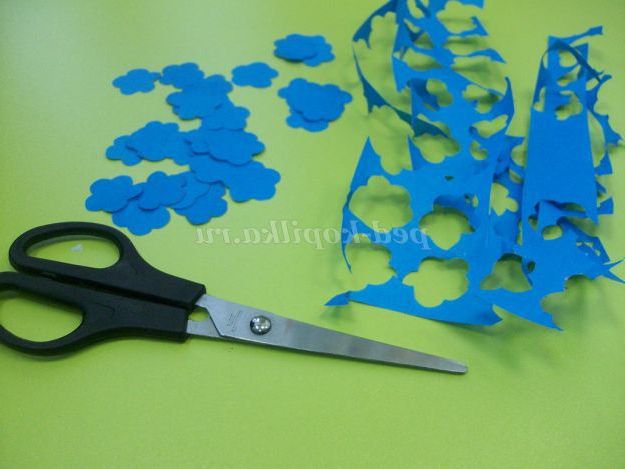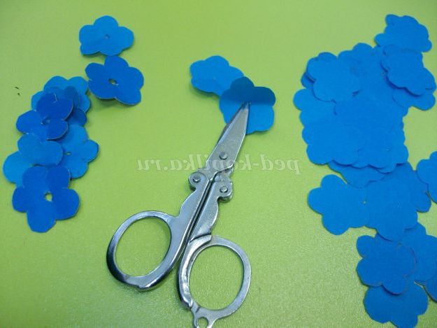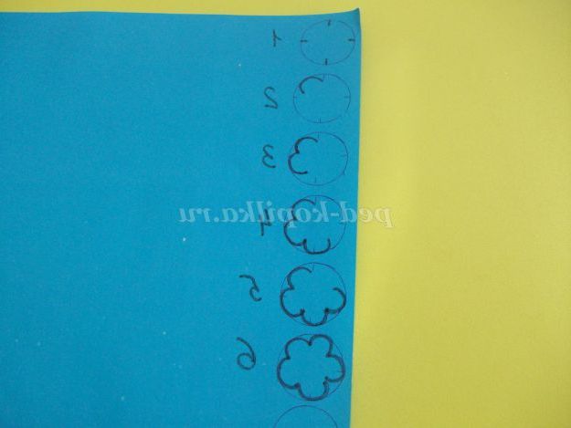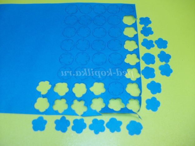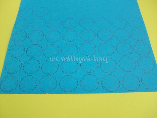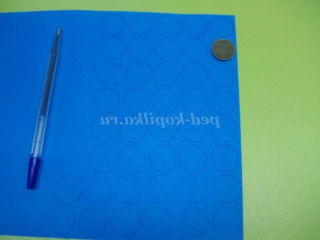 Спочатку робимо незабудки 42 штуки. За 3 квіточки в одній клумбі - це перевернена кришка. 12 міні - клумб. Для цього обводимо монетку кульковою ручкою (олівець погано видно на синьому папері).