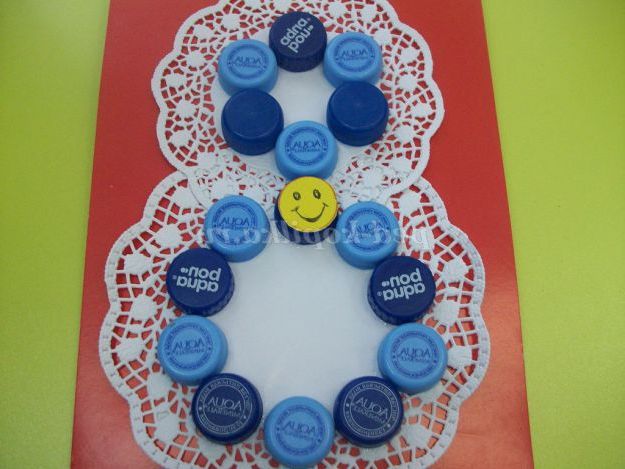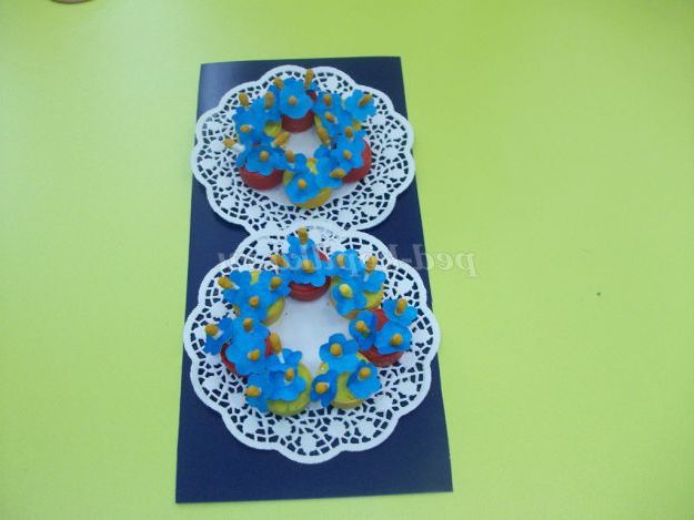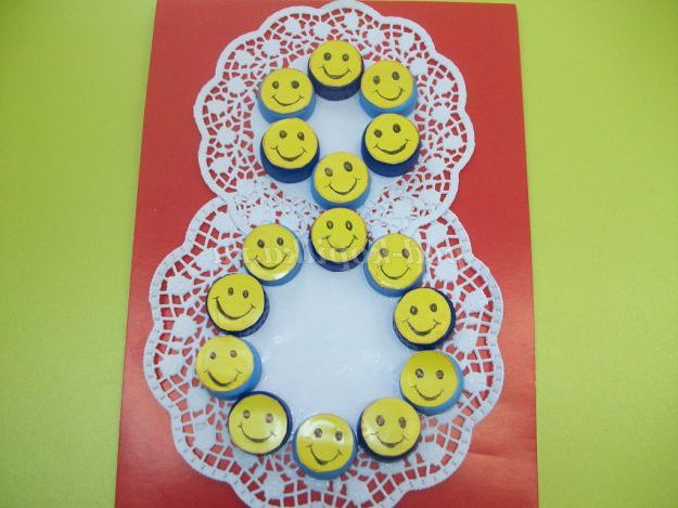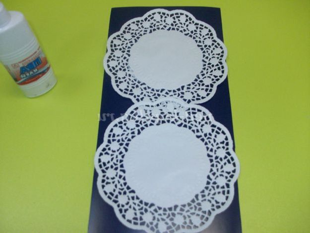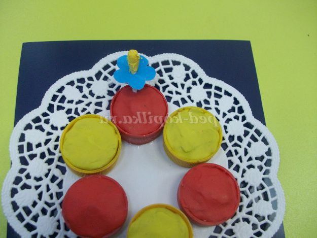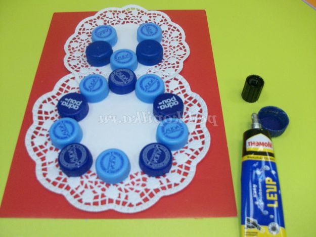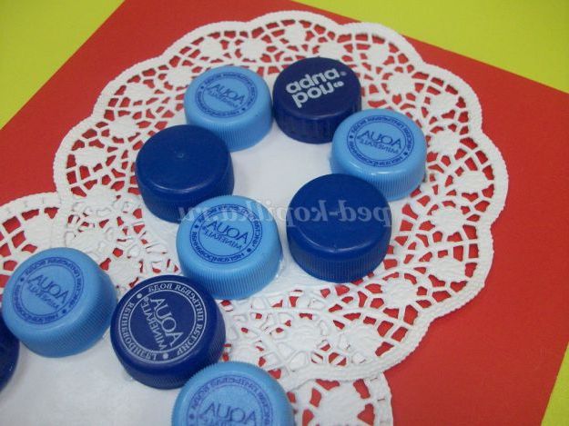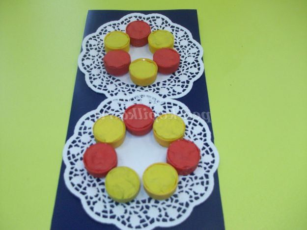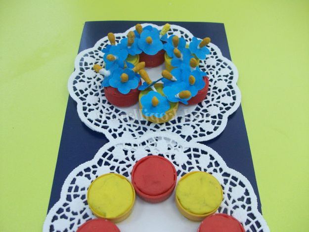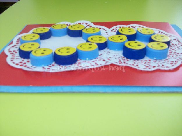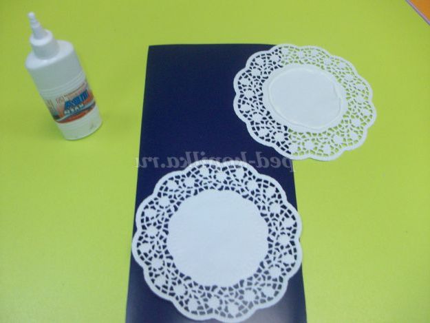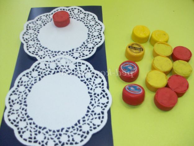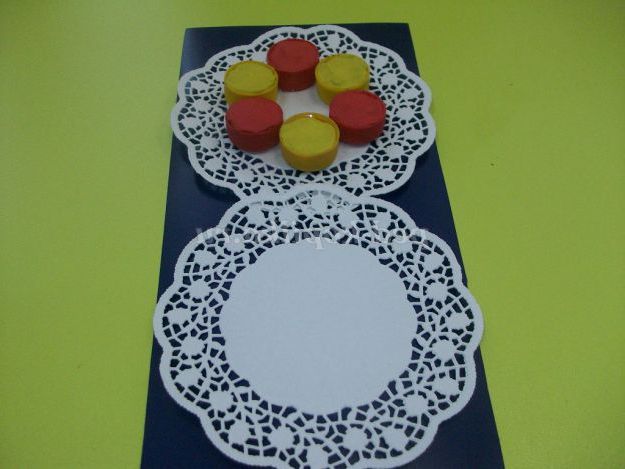 Беремо ажурні серветки різних диаметров.Наклеиваем кришки догори дном на листівку.