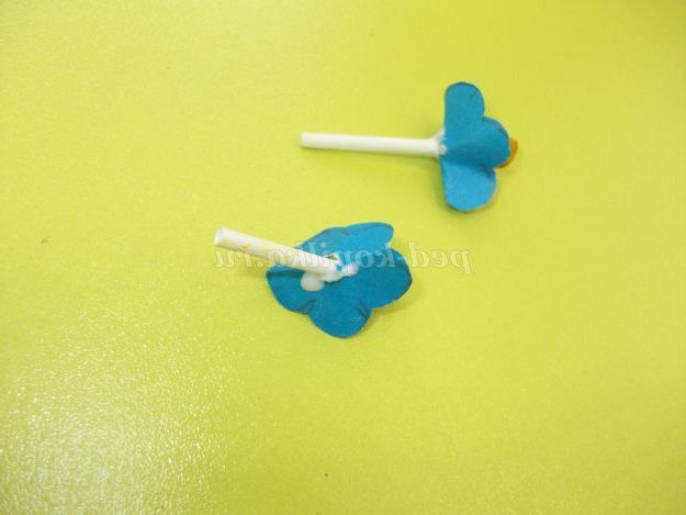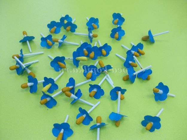 Протикаємо квітка. Вставляємо ватяну паличку зверху. Щоб пелюстки не з'їжджали вниз, трохи промазуємо клеєм. Незабудки наші готові 42 шт.