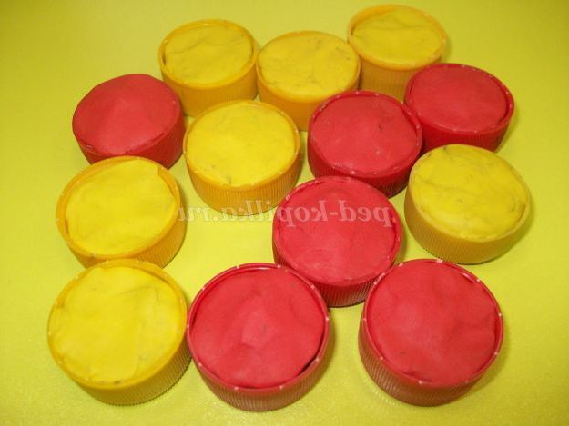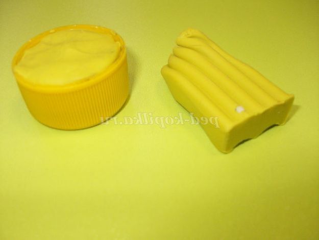 Приступаємо до заповнення наших маленьких клуб. Беремо пластилін в тон пробки і заповнюємо доверху.