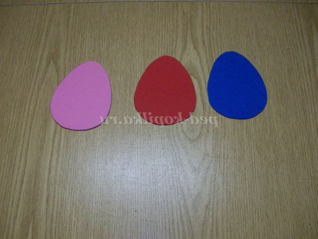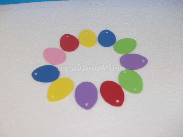 З кольорової декоративної пінки вирізаємо яйця. Робимо отвори за допомогою діркопробивача.