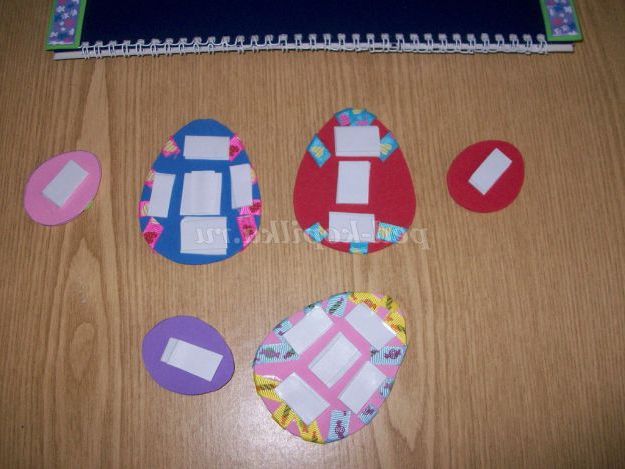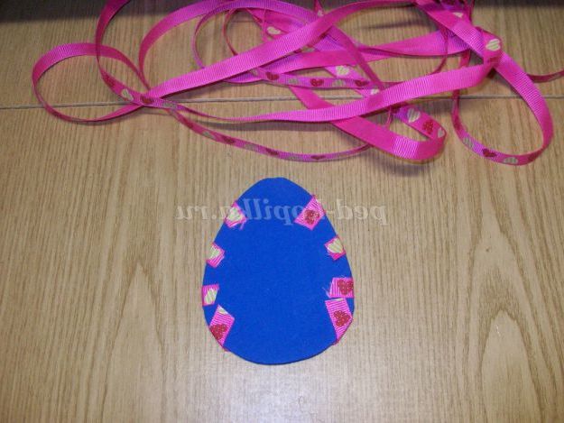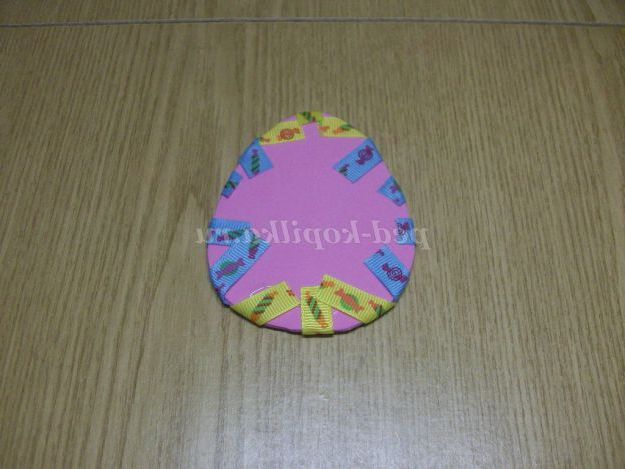 За допомогою двостороннього скотча приклеюємо готові кольорові великодні яйця на середню частину вироби.