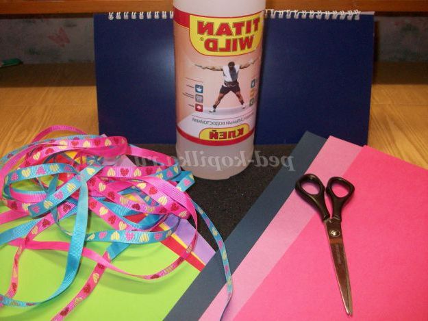 Необхідний матеріал: горщик, аерозольна фарба, гіпс, дирокол,атласні стрічки різної ширини, ножиці,кольорові намистини, клей момент прозорий.