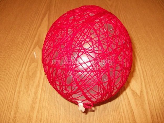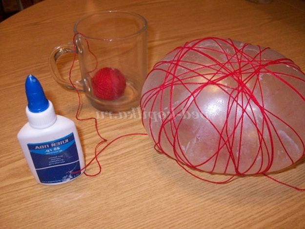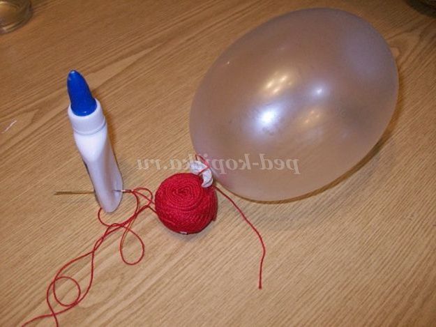 Беремо напальчник і надуваємо кульку, розміром приблизно 11 см, добре зав'язуємо, кінець нитки залишаємо. Беремо котушку ниток червоного кольору, поміщаємо в прозору кухоль, щоб полегшити намотування. А протягуємо кінець нитки в голку, проколюємо тюбик з клеєм знизу, зручніше працювати. Видавлюємо трохи клею, для кращого намокання нитки.