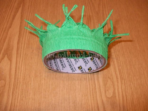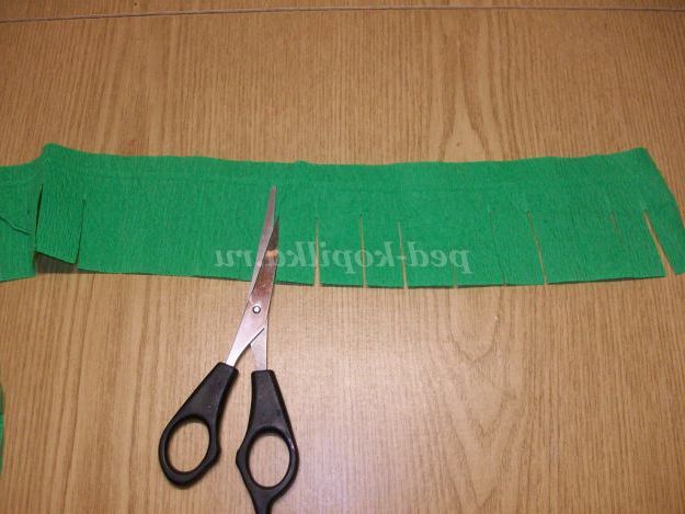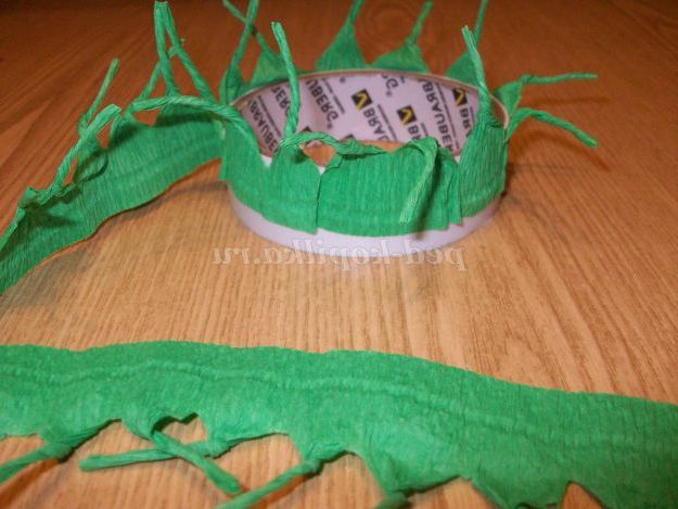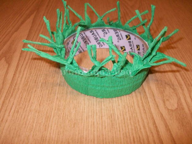 Із зеленої гофрованого паперу робимо травичку. Нарізаємо смужку довжиною, що дорівнює подвійній довжині підставці(брала використану котушку від скотча), шириною 6 см, надрізаємо тільки 4 см, кожну надрізану смужку скручуємо великим і вказівним пальцями. Майте на увазі, після цього пальці забарвляться зеленою фарбою.