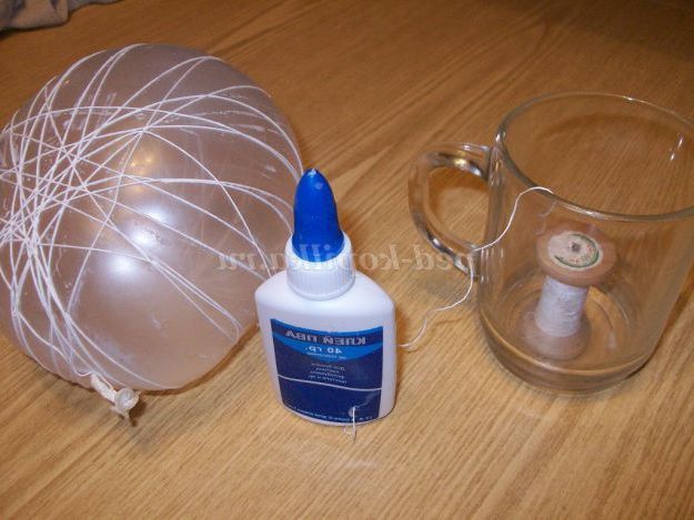 Надуваємо кульку з напальчника розміром приблизно 11 см добре зав'язуємо, кінець нитки залишаємо. Беремо котушку ниток білого кольору, поміщаємо в прозору кухоль, щоб полегшити намотування. А протягуємо кінець нитки в голку, проколюємо тюбик з клеєм знизу, зручніше працювати. Видавлюємо трохи клею, для кращого намокання нитки.
