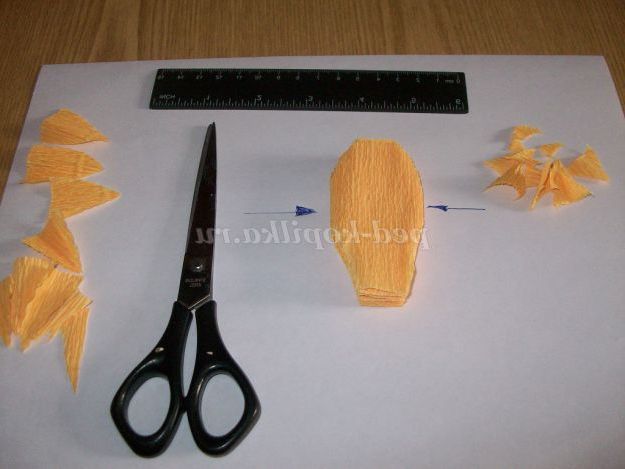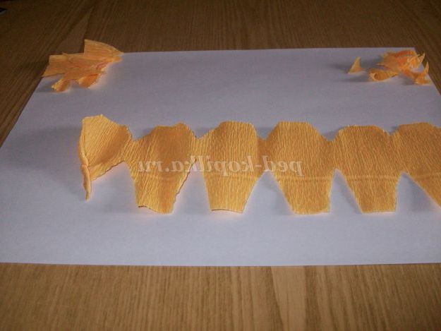 Робимо квіти білого і жовтого кольору. Гофрований папір складемо гармошкою на 7 - 9 пелюсток (кожен шар-пелюстка) шириною 2,5 див Відрізаємо висотою 6 див.