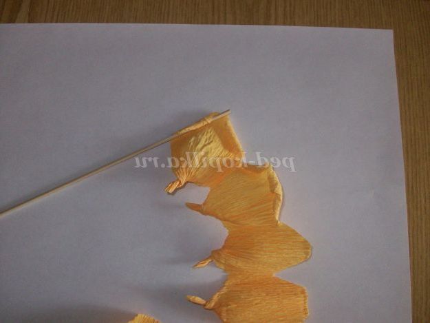 Беремо шпажку і накручуємо на неї цей край, стискаємо папір. Це добре фіксує вигин пелюстки. Для опуклого ефекту необхідно кожна пелюстка витягнути вглиб. Використовуємо два великих пальці наших рук.