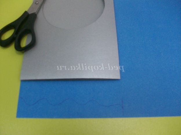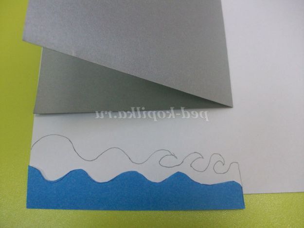 На блакитну папір накладаємо заготівлю і по ширині листівки малюємо хвилі. Вирізаємо.