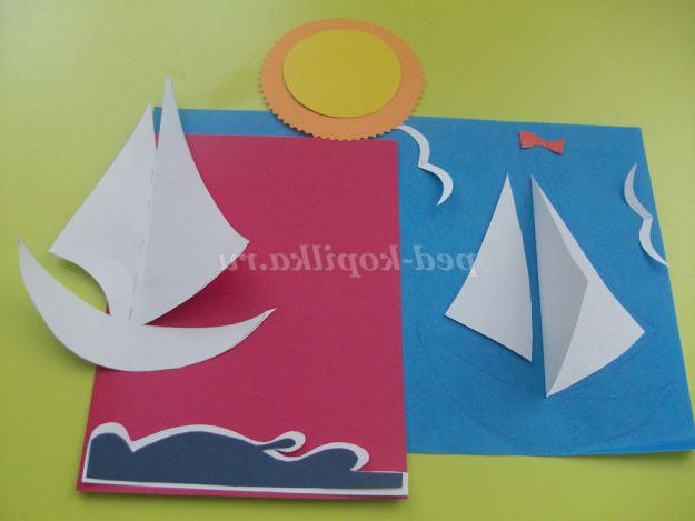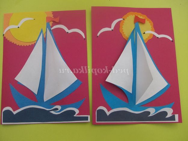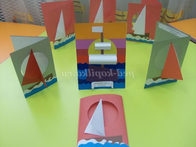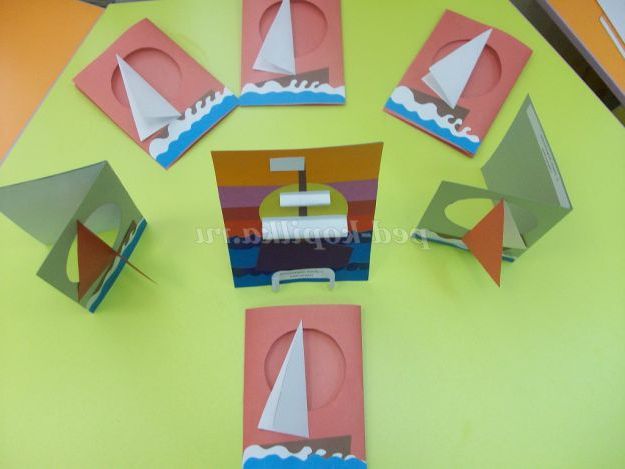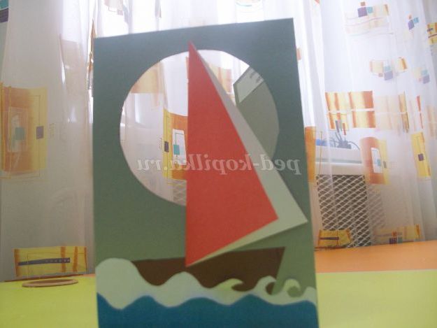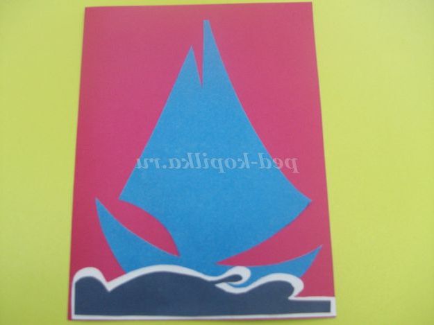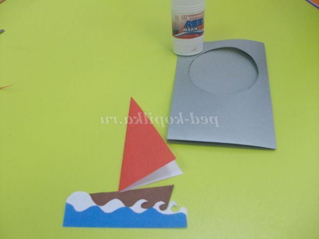 Всі деталі вирізані. Починаємо наклеювати їх на листівку. В першу чергу приклеюємо човен.