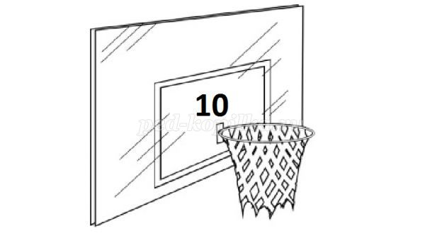 На дошці вивішують малюнки з баскетбольними корзинами і на них числа. Завдання: придумати якомога більше прикладів, відповіддю на які буде число над кошиком.