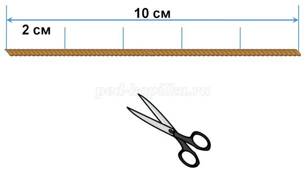 Скільки разів потрібно відрізати, щоб мотузку довжиною в 10 див. розділити на частини по 2 див. кожна? (4 рази)
