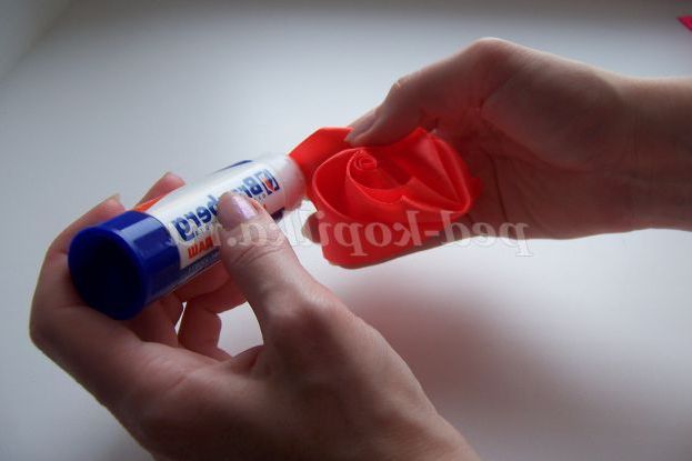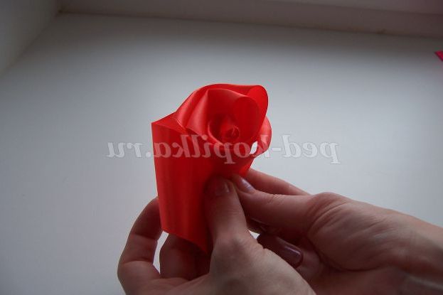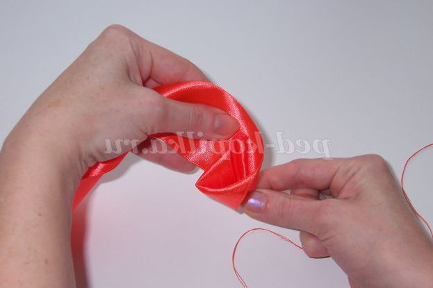 8. Закріплюємо виток знизу і продовжуємо далі, перегинаючи спочатку по діагоналі стрічку, потім утворюючи вир навколо середини намагаючись, щоб внизу край стрічки був на одному рівні, тобто посередині, одночасно надаючи пелюсткам природний обсяг.
