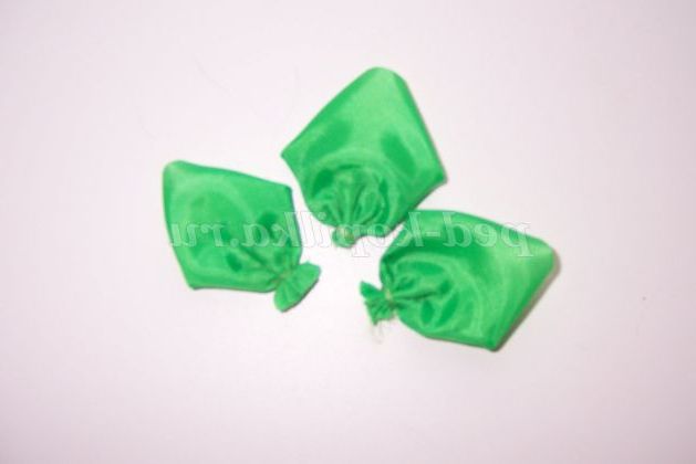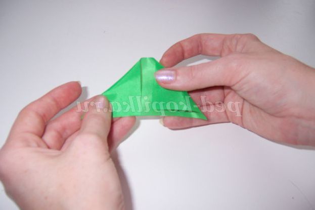 Для цього нам знадобиться 3 деталі зеленої атласної стрічки. Деталь беремо в руки виворотом вгору і утворимо трикутник, загинаючи верхні кути деталі до центру встик один одного, потім нижні кути підгинаємо до центру, накладаючи один на одного.