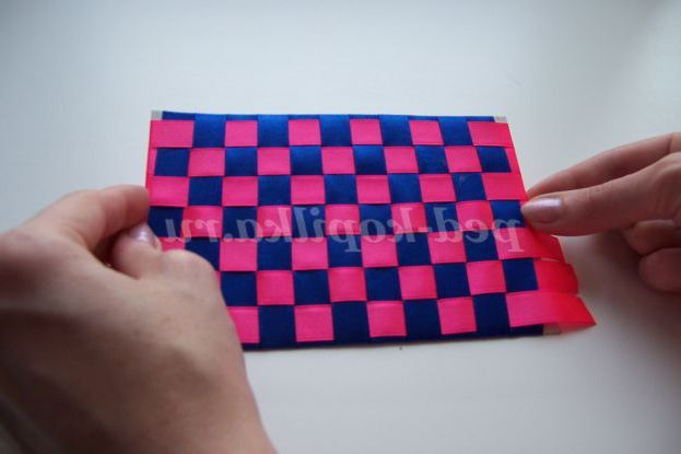 Ми виберемо найпростіше і поширене переплетення ниток - полотняне. У ньому кожна нитка основи переплітається з уточной через одну. Таким чином, рожеві стрічки переплітаємо через сині стрічки і закріплюємо їх клеєм на виворітній стороні.
