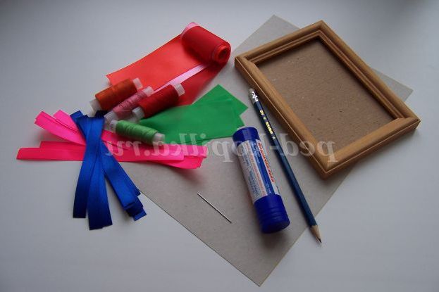 Матеріали: дерев'яна рамка для фотографії 10х15 див., щільний картон 1 лист, нитки 4 шт., атласні стрічки трьох різних кольорів 5х50 див. 3 шт., зелені атласні стрічки 5х10 див. 3 шт., рожеві атласні стрічки 1х17 див. 7 шт., сині атласні стрічки 1х12 див. 11 шт.
