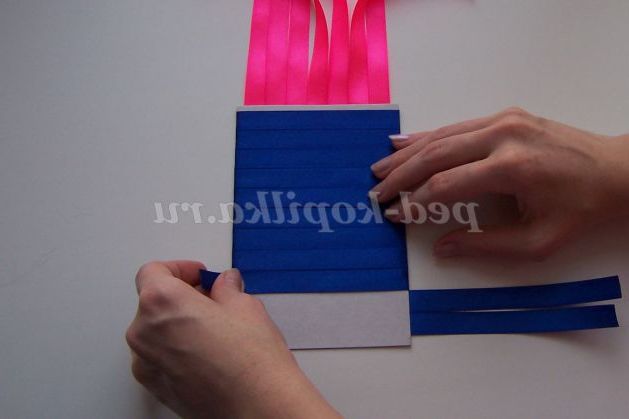 2. На основу з картону приклеюємо стрічки лицьовими сторонами вгору, встик один одному, відступивши від країв 0,5 см, праворуч йдуть рожеві стрічки, зверху сині.