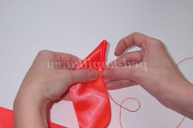 Для цього нам знадобляться нитки, голка, ножиці, атласні стрічки трьох кольорів шириною 5 см завдовжки 50 див. підпалені з країв.