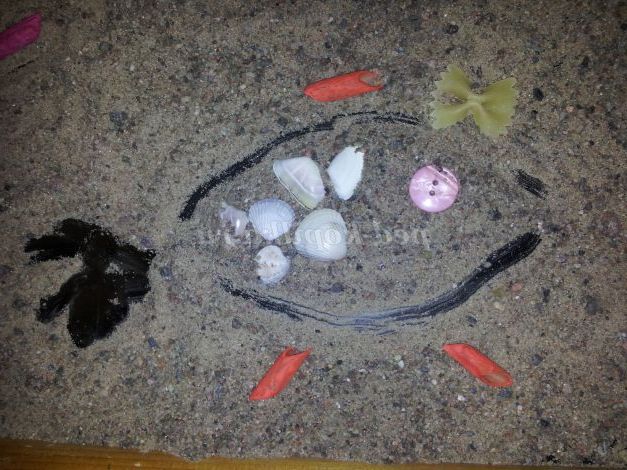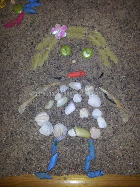 Можна пропонувати вихованцям поекспериментувати з кольоровим піском, або ж з використанням (як підкладки) кольорового паперу, напівпрозорих і морських каменів.