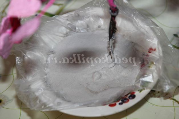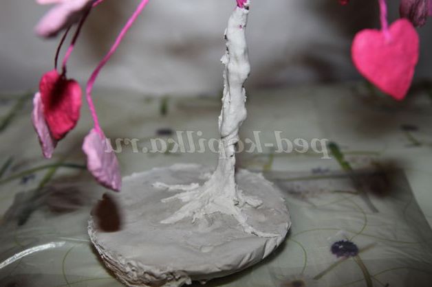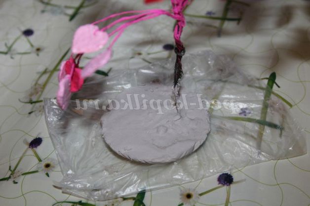 У ємність (тарілку) поставимо кільце з сердечками і заллємо гіпсом. Попередньо покласти в ємність целофановий пакет, щоб легко відокремити наше дерево від ємності.