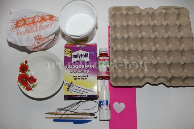 Для виготовлення паперової маси: лотки з-під яєць, клей ПВА, клей шпалерний, ємність,