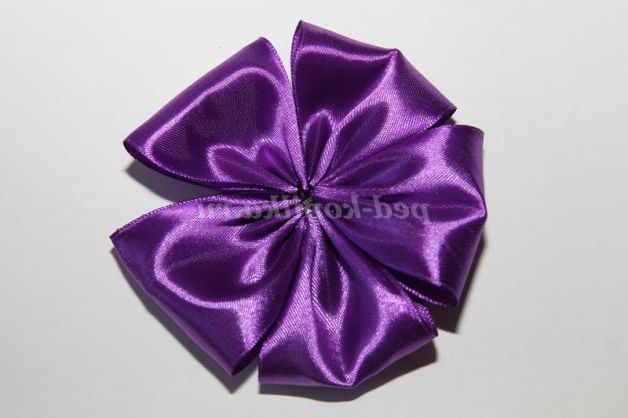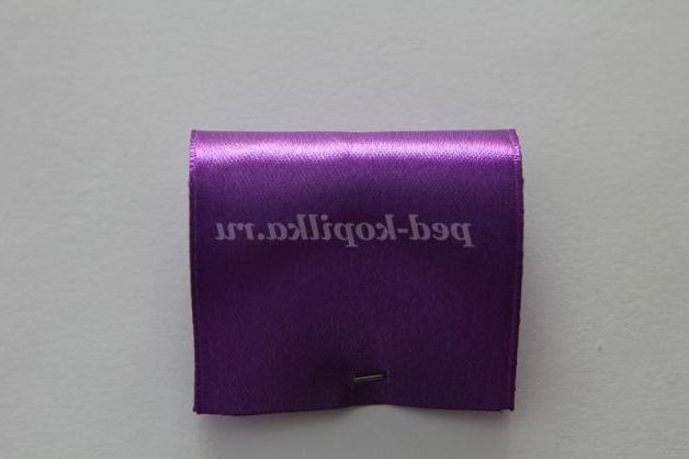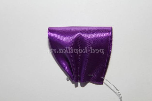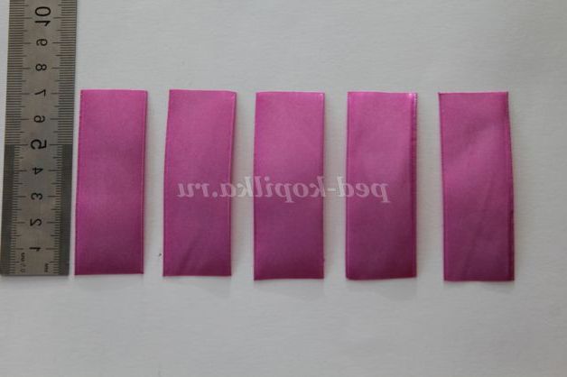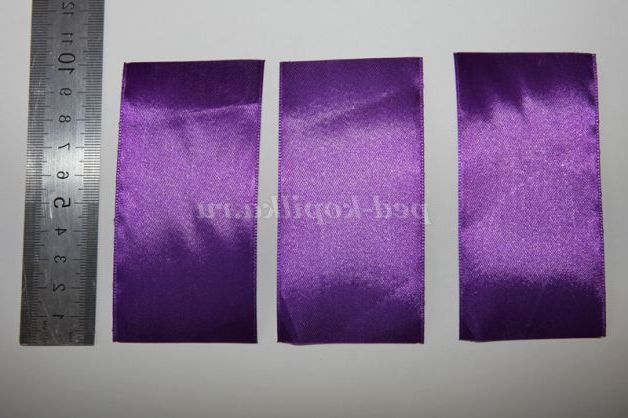 Атласну стрічку фіолетового кольору шириною 5 см з допомогою випалювача і металевої лінійки працюючи на склі, наріжемо довжиною 10 см. 5 штук.