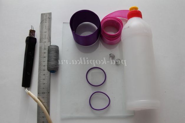 Для виготовлення гумки вам знадобляться наступні інструменти і матеріали: атласна стрічка рожевого кольору шириною 2,5 див, атласна стрічка фіолетового кольору шириною 5 см., скло, випалювач, металева лінійка, гумка фіолетового кольору, клей, красива срібляста ґудзик, нитка і голка.