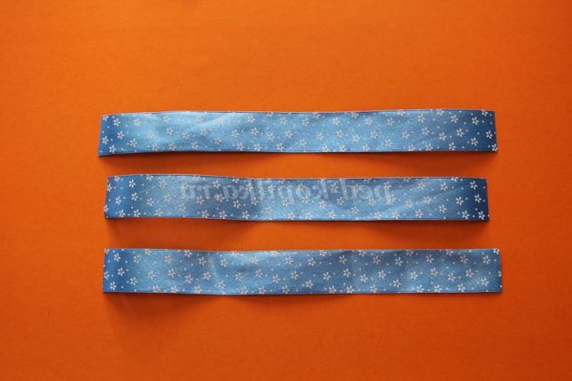 Атласну стрічку блакитного кольору з допомогою випалювача і металевої лінійки працюючи на склі, наріжемо довжиною 22 див. 3 смужки.