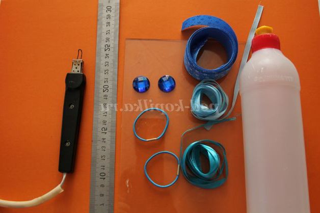 Для виготовлення гумки вам знадобляться наступні інструменти і матеріали: атласна стрічка блакитного кольору шириною 2,5 див, атласна стрічка 0,5 див. двох блакитних відтінків, стрази, скло, випалювач, металева лінійка, гумка блакитного кольору, клей.