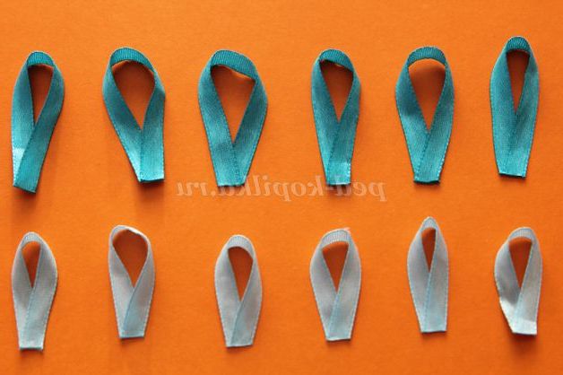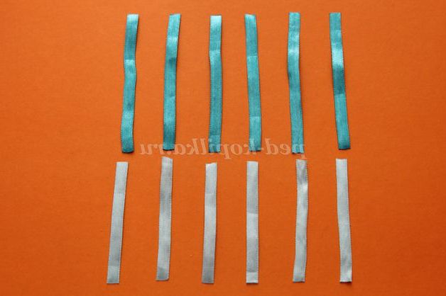 Візьмемо дві стрічки блакитного відтінку, і з допомогою випалювача і металевої лінійки працюючи на склі, наріжемо довжиною 9 див. 6 штук одного кольору і 7 див. іншого кольору.