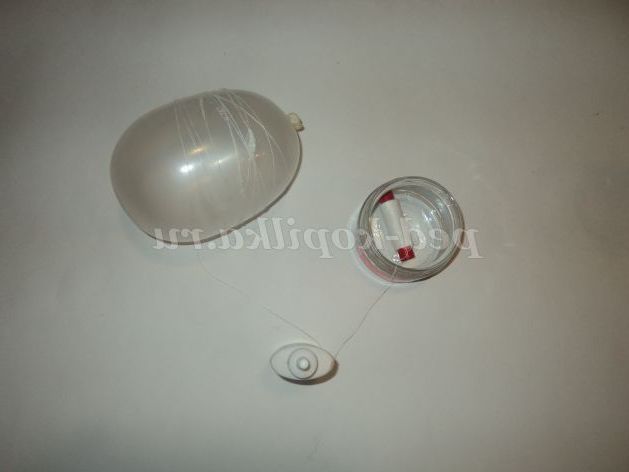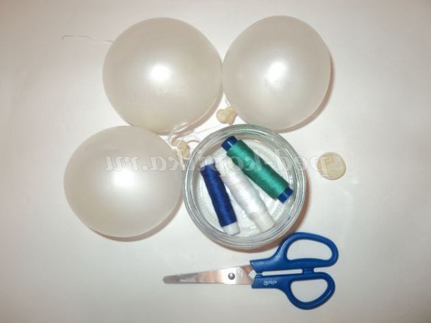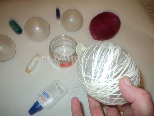 5. Візьмемо одну руку надутий напальчник і будемо обмотувати його білою ниткою. Нитка просочується клеєм. Намотуємо нитку до кінця.