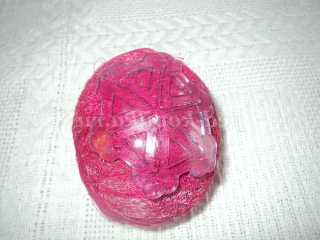 6. Візьмемо ще один надутий напальчник. Обмотуємо його червоною ниткою. Наступний надутий напальчник обмотуємо зеленою ниткою. Вийшли мокрі кокони. Покладемо їх сохнути на клейонку на 3 години. Коли кокони висохнуть з них треба вийняти напальчники, проколів їх голкою.