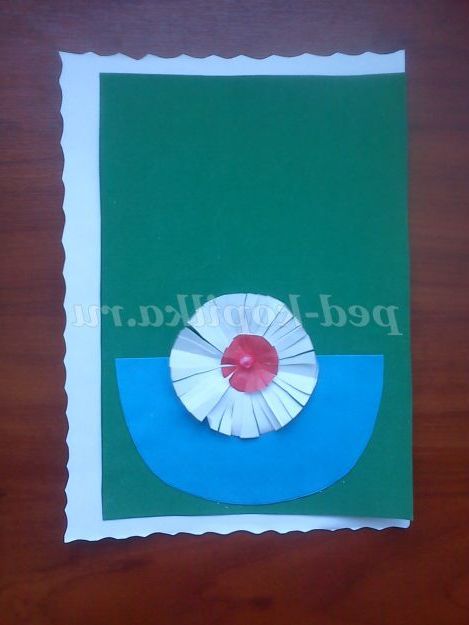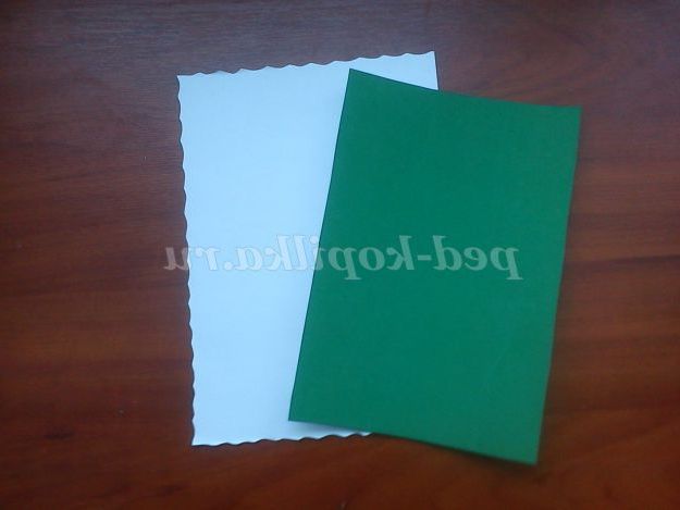 2. Аркуш білого паперу складемо навпіл і фігурно обріжемо край. Зверху приклеїмо зелену папір меншого розміру.