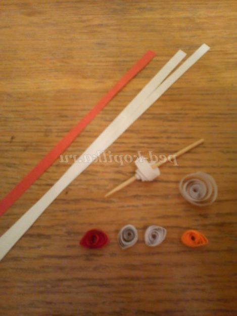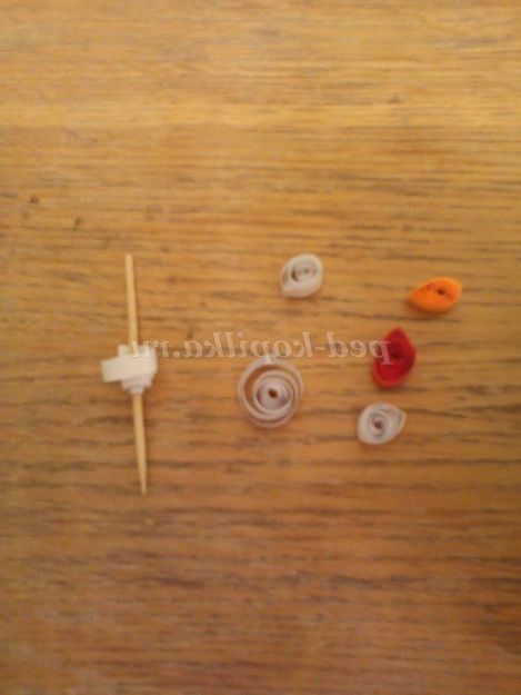 7. Отримуємо роли білі і червоні. Формуємо квиллинговые фігури-краплі. Для цього оттянем середину спіральки в одну сторону.С іншого боку стискаємо кілька шарів, щоб отримати гострий кінець.