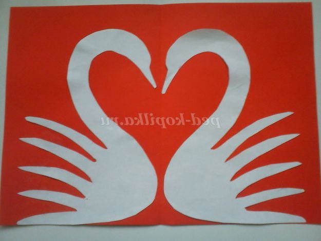 3.Вырежем двох лебедів і наклеїв на аркуш червоного картону, зігнутого навпіл.