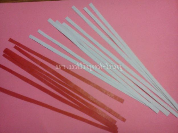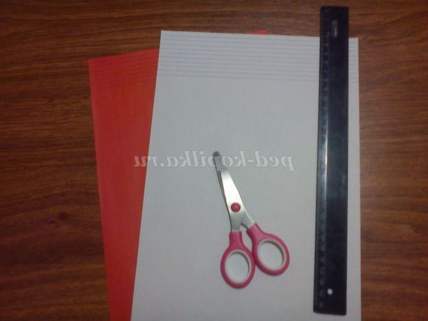 4. Беремо аркуш білого і червоного паперу. Розкреслите листи за допомогою лінійки на смужки по 0,6 див.