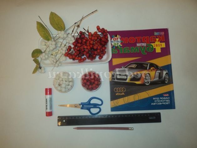 Нам знадобиться кольоровий картон, аркуш білого паперу, клей, ножиці, ягоди, олівець.
