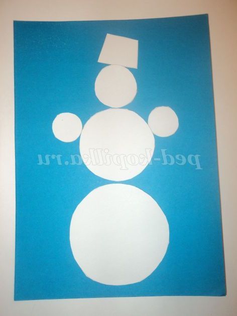 Намалюємо на аркуші білого паперу 5 кіл і чотирикутник. Радіус великого кола для сніговика-5 см, середнього-4 см, голови-2 див. Руки сніговика-радіус кіл 1,5 см
