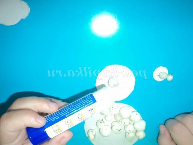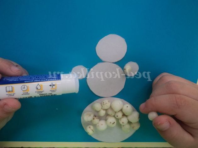 Приклеюємо чорні ягоди (очі) і червону ягідку (рот) до нашого сніговичку.