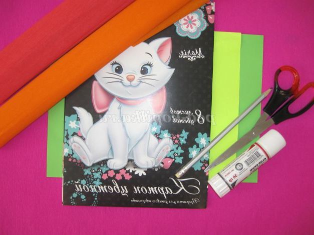 Ножиці,клей-олівець,червона,жовта і светлозеленая принтерний папір лощений темнозелений картон,помаранчева і червона гофрований папір.