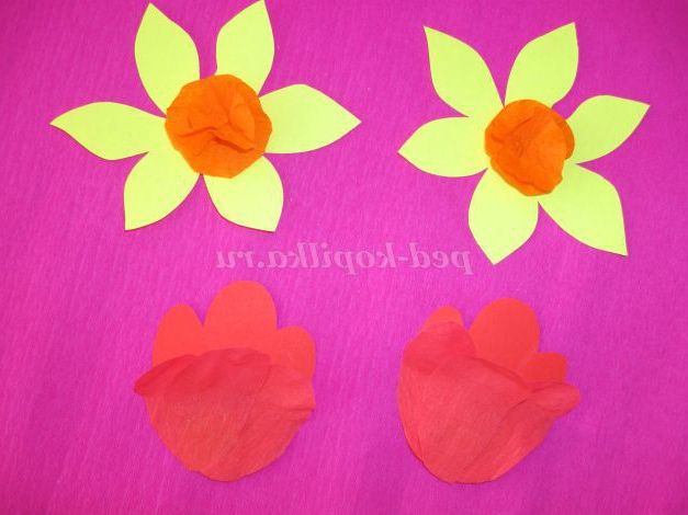 Гуртки з гофрованого помаранчевої папери трохи приминаем, мнемо і по два приклеюємо в центр жовтих квітів,на кожен великий червоний квітка приклеюємо з боків 2 бокові пелюстки з червоної гофрованого паперу і зверху по центру центральний листочок, трохи краї та центр розтягуючи і відгинаємо