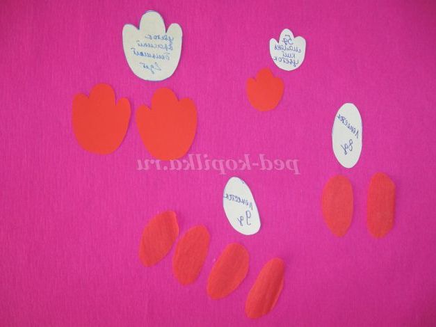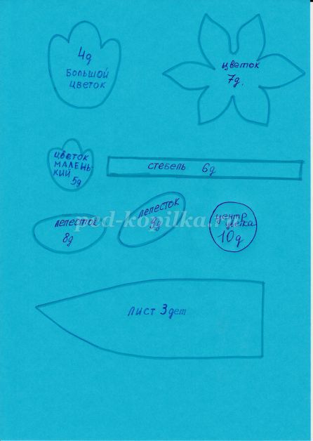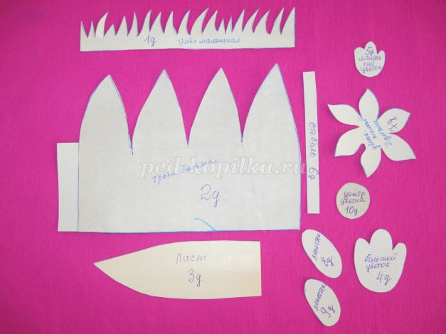 Обводимо на червоному папері великий червоний квітка дет 2 2 шт, маленький квітка дет 5 1 шт,на червоній гофрованого паперу пелюстка бічній і центральний дет 9 4 шт і дет 8 2 шт і вирізаємо