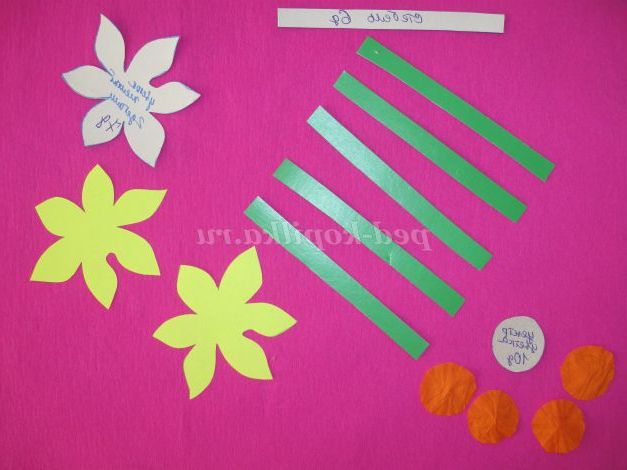 Обводимо на темно зеленому картоні стебло дет 6 5 шт, на жовтому папері квітка дет7 2шт,на помаранчевій гофрованого паперу