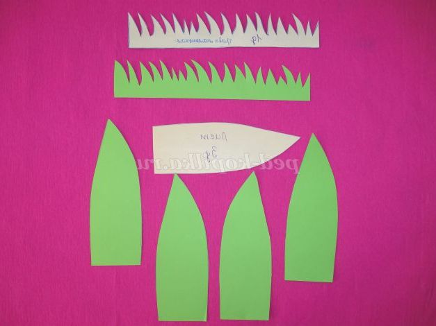Обводимо на світло-зеленої папері маленьку травичку дет 1 1 шт, лист дет 3 4 шт і вирізаємо