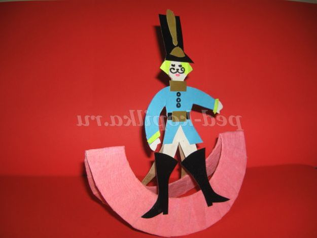 Педагог перевіряє готовність дітей до заняття,пригадують правила роботи з використовуваними матеріалами і инструментами.Обьясняет технологію виготовлення солдата(використання шаблонів),принцип виготовлення підставки неваляшки для солдата.