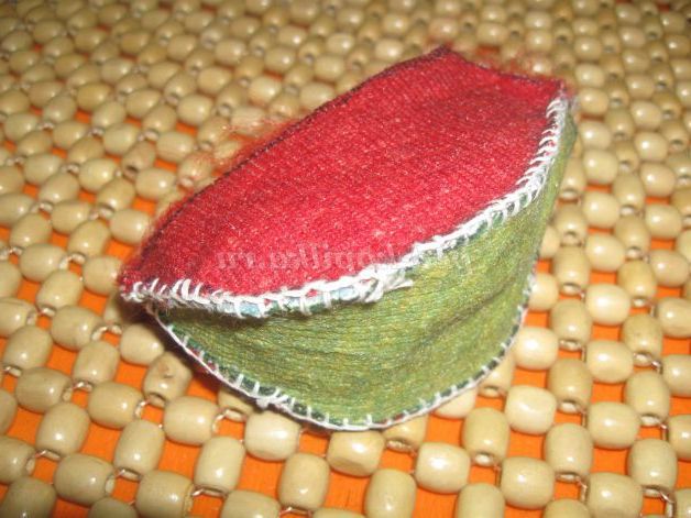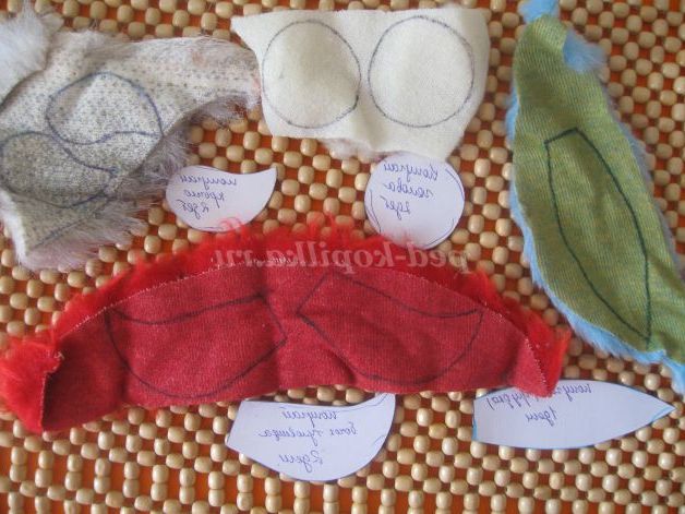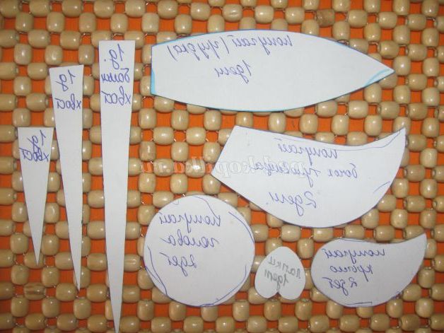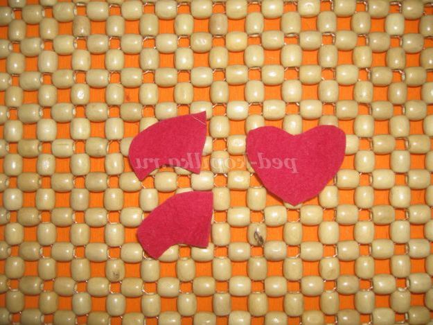 На фетре червоного кольору викроюємо лапки і дзьоб дві деталі
