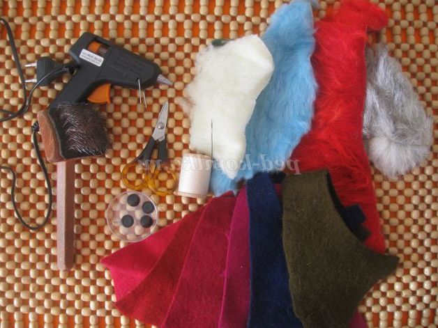 Шматки кольорових синтетичних шматків хутра, шматочки червоного фетру, синтепон, нитки і голка для