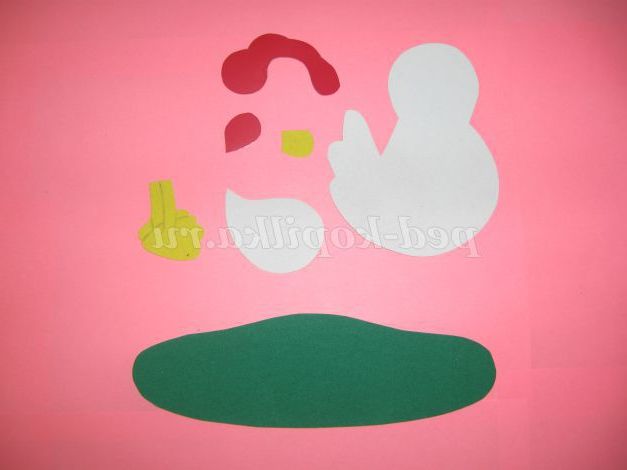 Викроюємо тулуб курочки (біле)-7 дет, галявина (зелена)- 6 дит, чубчик (червоний)-10 дет, дзьобик (жовтий)-12, борідка (червона)-11/1, крило (біле)-8 дет,