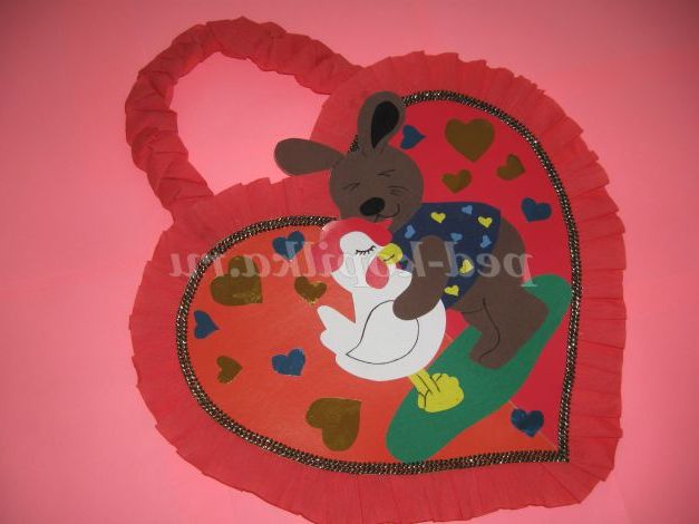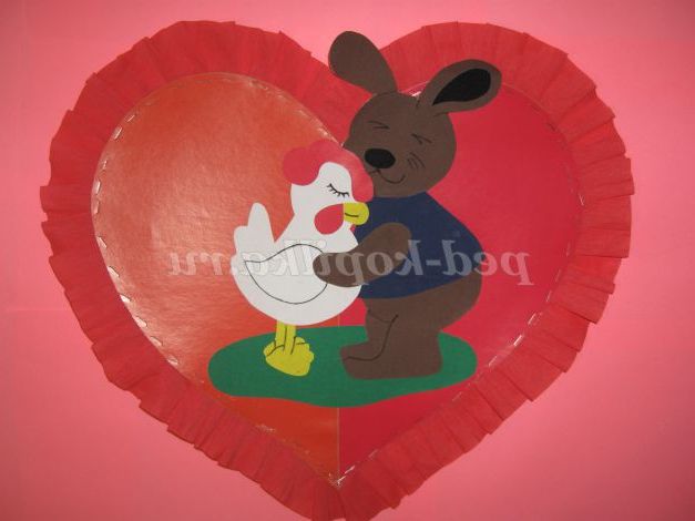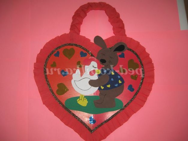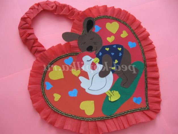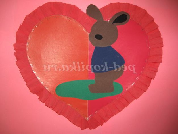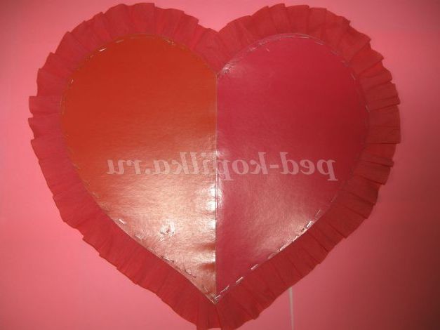 Вирізаємо серце приклеєне на картон.Отрезаем дві смужки гофрованого паперу 80 см завдовжки і 4 см завширшки і обтачиваем сердечко смужками начебто рюшь, закладаючи в складочки, кріпимо за допомогою степлера по периметру.